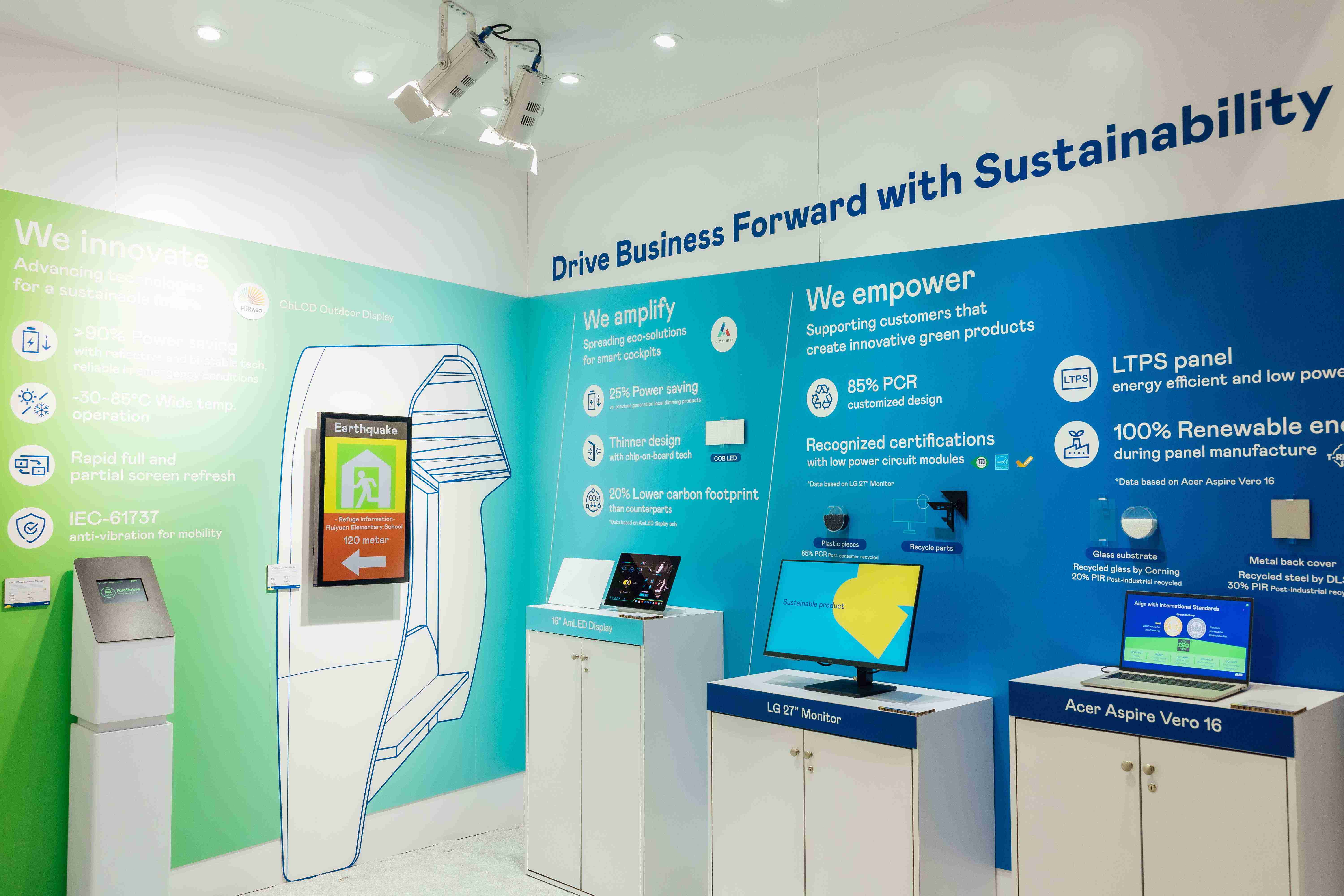 z6尊龙运用创新显示技术HiRaso胆固醇液晶双稳态技术达到显示零耗能、、、、扩大节能省电的AmLED显示技术应用于车用产品、、、以再生的消费后回收(PCR)塑料及全绿电生产之面板,,应用于笔电及萤幕,,,增加绿色价值。。