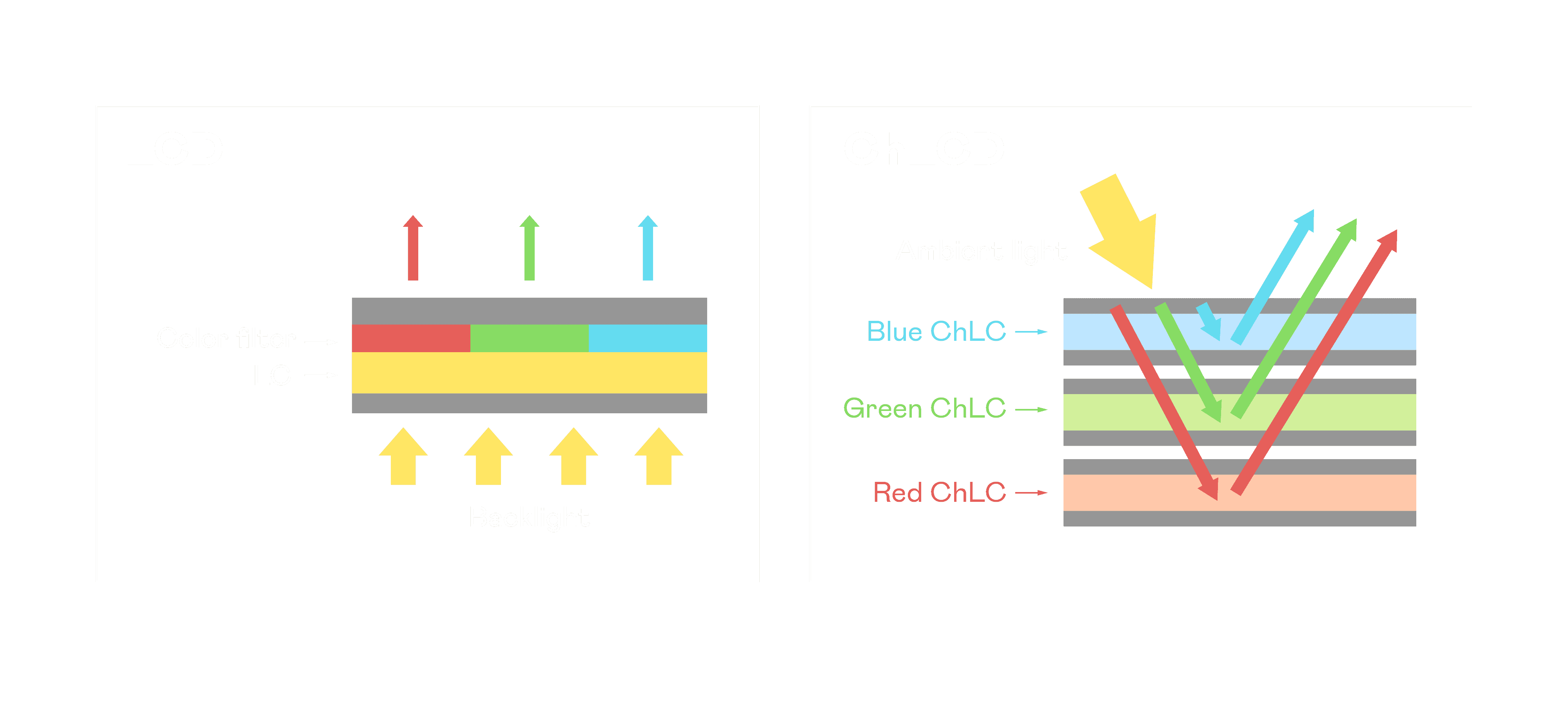 ChLCD 胆固醇液晶就如同纸张一样,,透过反射环境光来显示影像,,,,因此长时间观看不易造成人眼视觉疲劳,,,,可达到护眼效果。。当处于户外阳光下使用,,LCD 影像容易失真而不易观看,,,,但胆固醇液晶仍可维持较佳的影像品质。。。