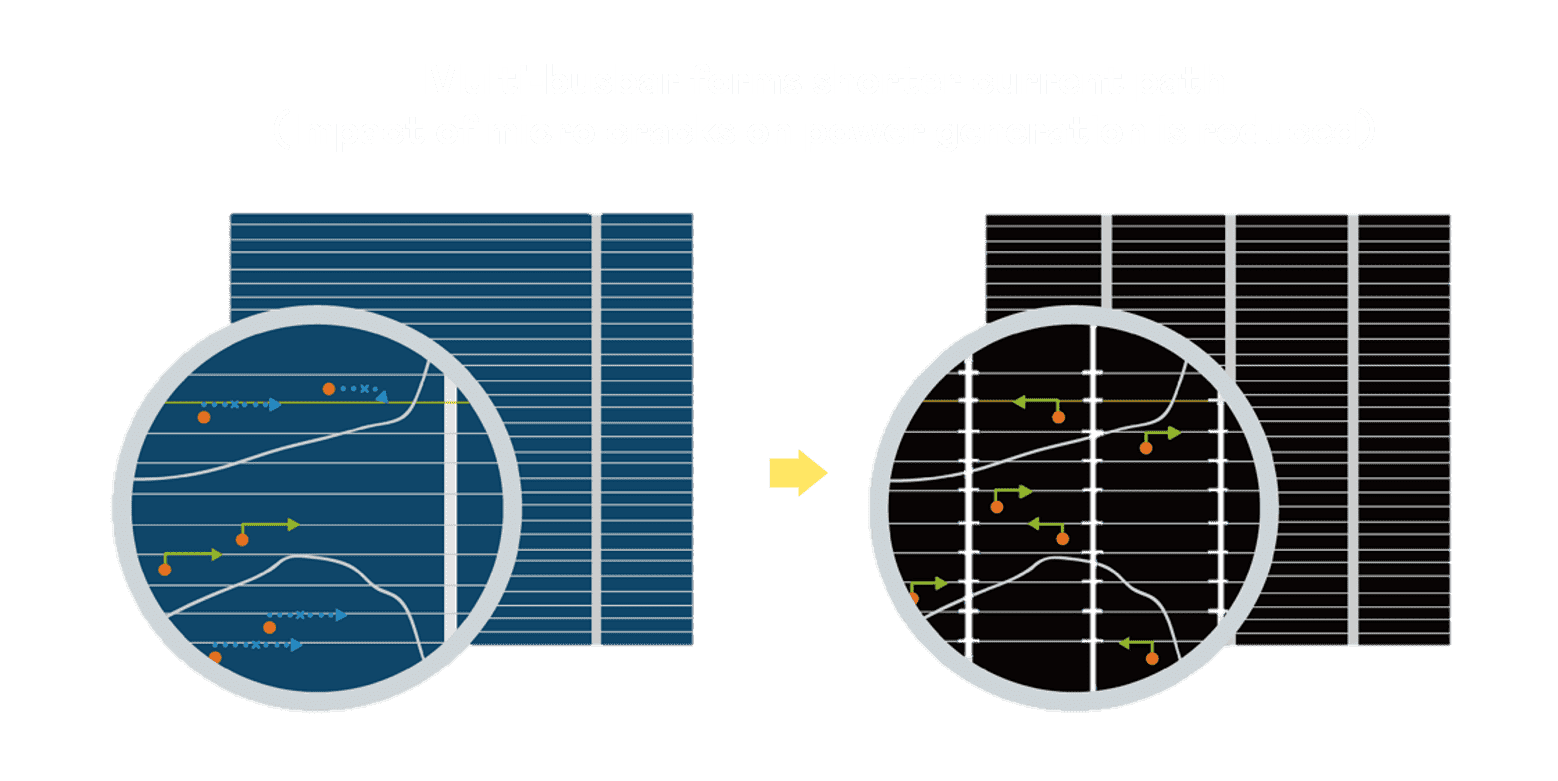 - 电池使用多条铜导线 (Copper wire) 于电池片上形成较短的电流路径,,,提高电流收集效率,,,采用圆形设计的铜导线较传统扁平式的铜焊带 (Ribbon),,可增加入射至电池的光线量。。